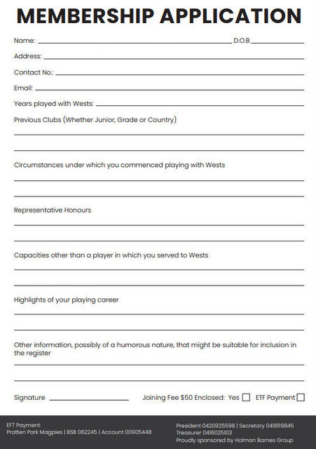 [Article 120]Membership Application Form To print this form click ‘Control-P’ then ‘Print’ Don’t forget tell your old team mates about joining the Pratten Park Magpies. Comments are closed.