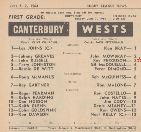 Roys first First Grade game for Wests in 1964